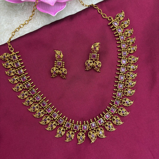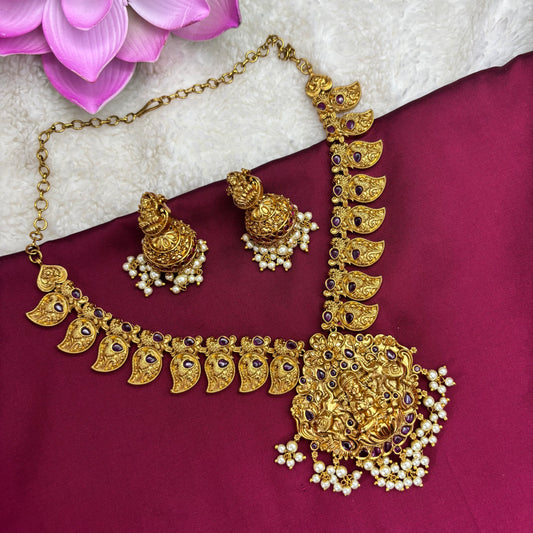 Sacred Bloom – Temple & Mango Design Necklace Set with Pink Stones and Jhumkas