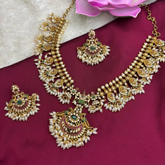 Heritage Glow – Guttapusalu Necklace with Rice Pearls, Pink & Green Kemp Accents