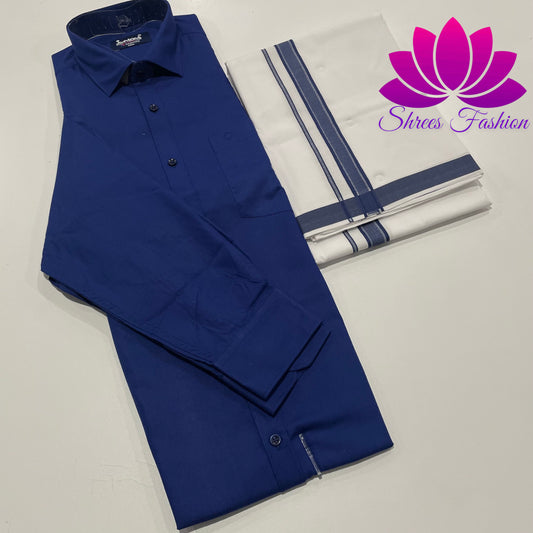 Sapphire Sophistication: Blue Shirt Paired with Classic Veshti/Dhoti Ensemble