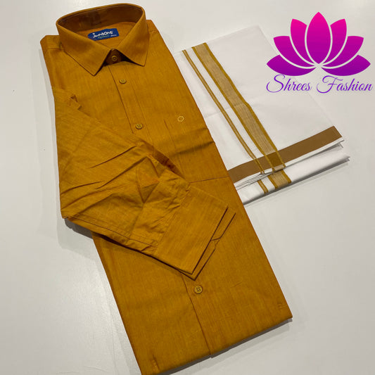 Gilded Opulence: Goldish Shirt Paired with Classic Veshti/Dhoti Ensemble