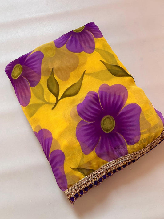 Sunlit Bloom Yellow Georgette Saree with Purple Floral Print