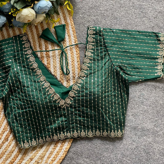 Bottle Green V-Neck Blouse with Antique Gold Embroidery
