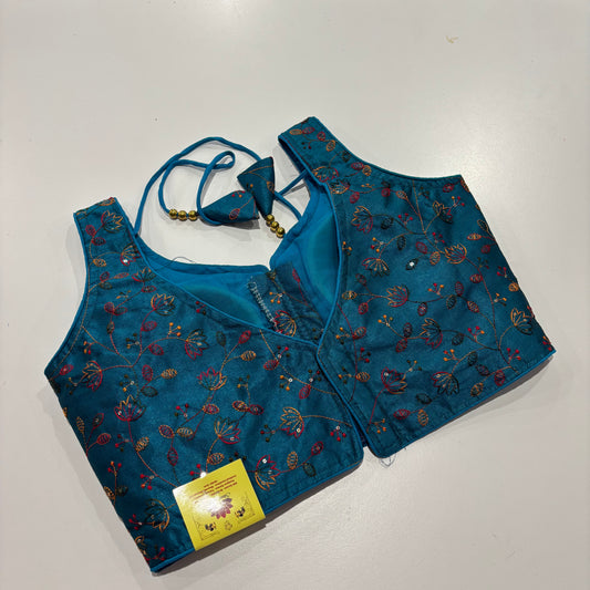 Blue Readymade Blouse with Gold Embroidery & Attached Sleeve Fabric