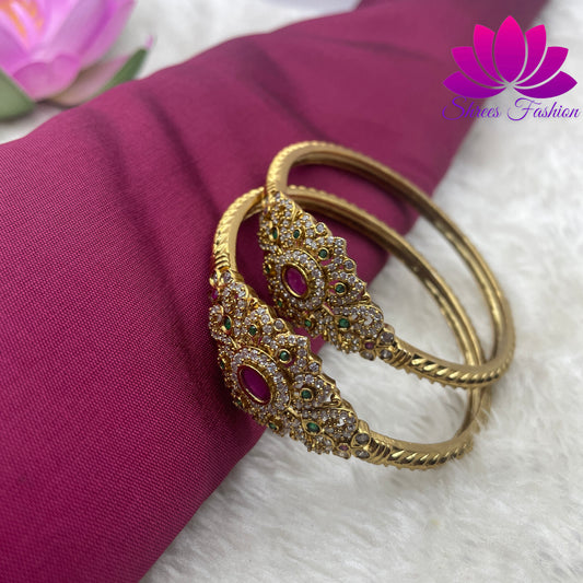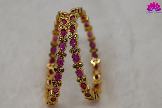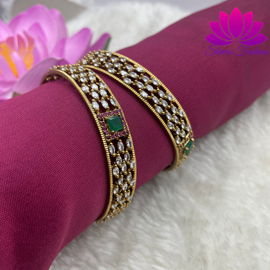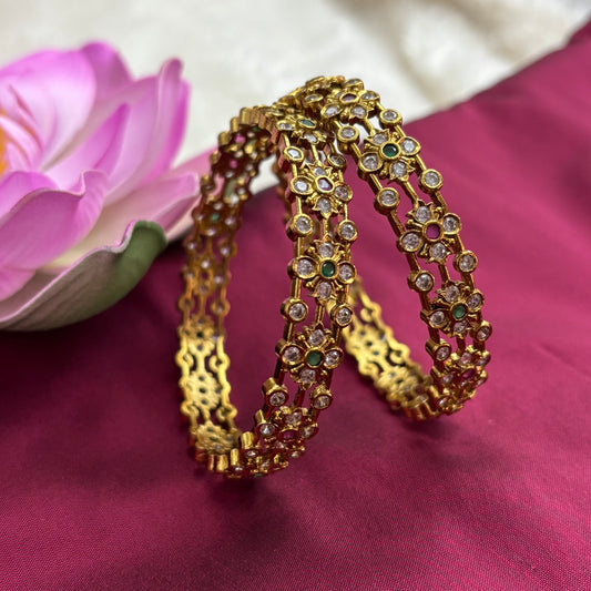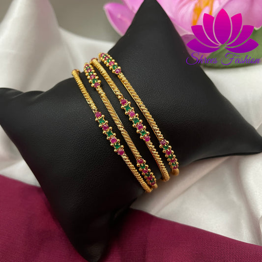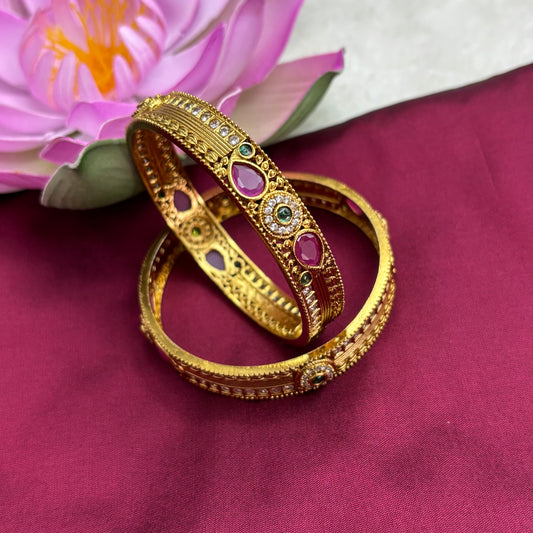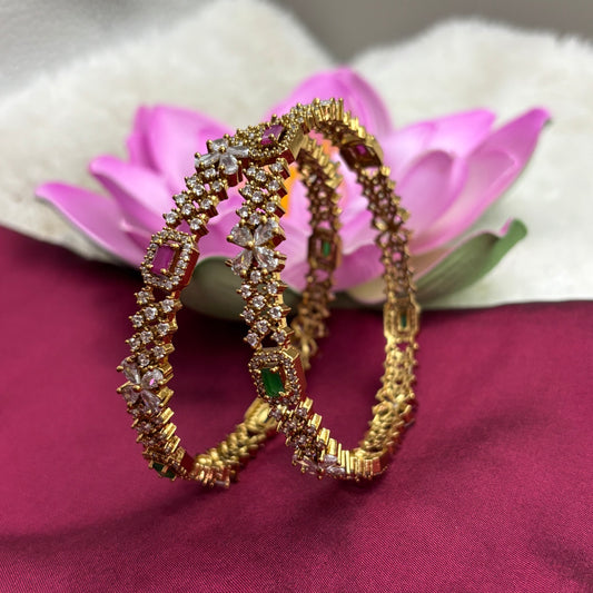 Matte Gold Finish CZ Stone Bangles – Green & Pink Accents