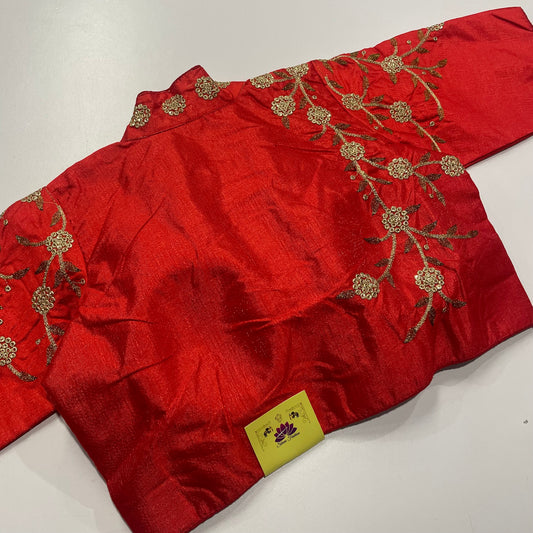 Red Collar Neck Ready-Made Blouse with Gold Embroidery – Bold & Graceful Pairing for Sarees
