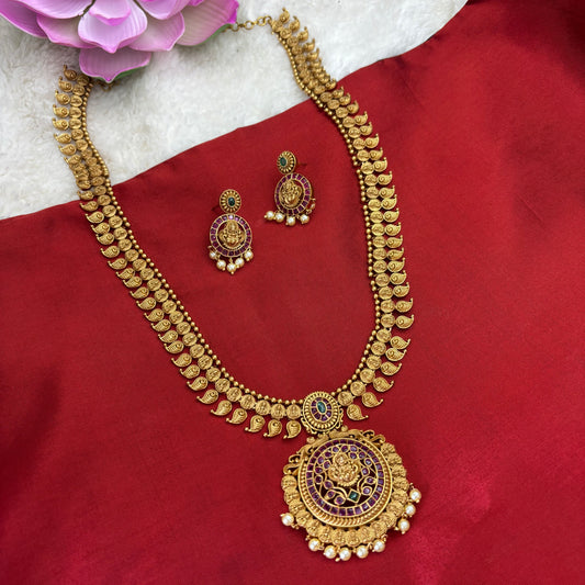 Coin Mango Design Long Haram Set – Matte Gold Finish with Kemp Stones