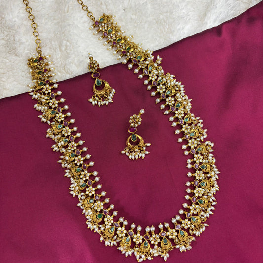 Regal Tradition – Guttapusalu Long Haram Set with Green & Pink Stones and Rice Pearl Clusters