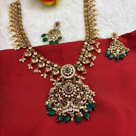 Exquisite Kemp and Cubic Zirconia Stones Long Haram with Chandbali Pendant and Earrings