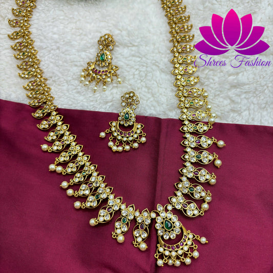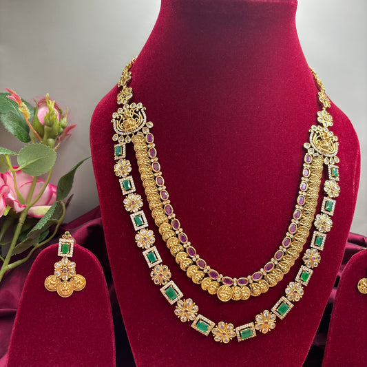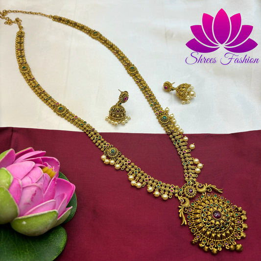 Antique Gold Finish Temple Design CZ Stones Long Haram