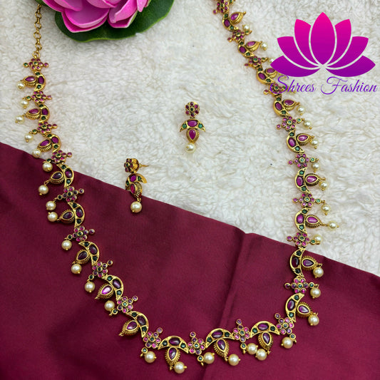 Regal Radiance: Matte Gold Kempu Stone Long Haram"