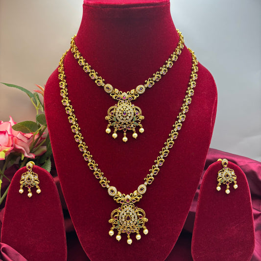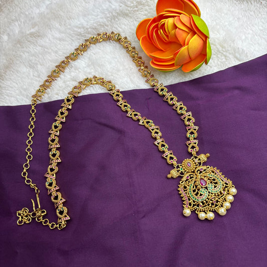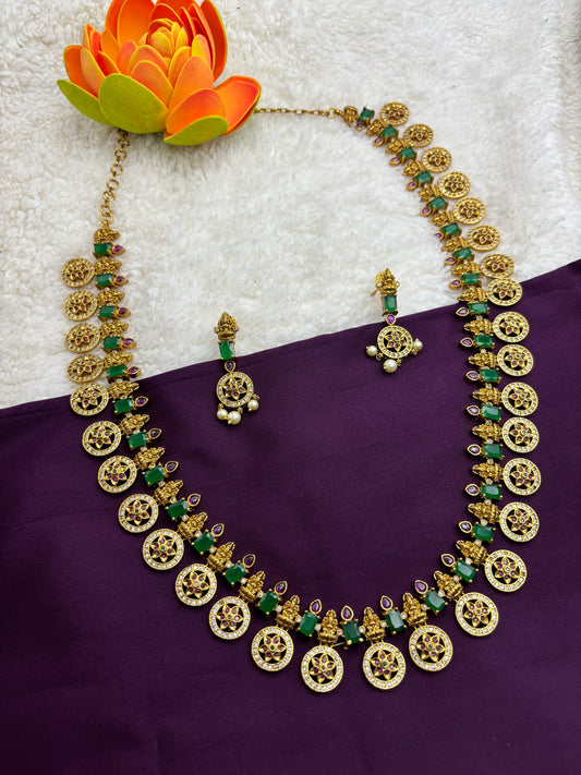 Divine Grace – Temple & Coin Design Long Haram with Green & Pink Stones