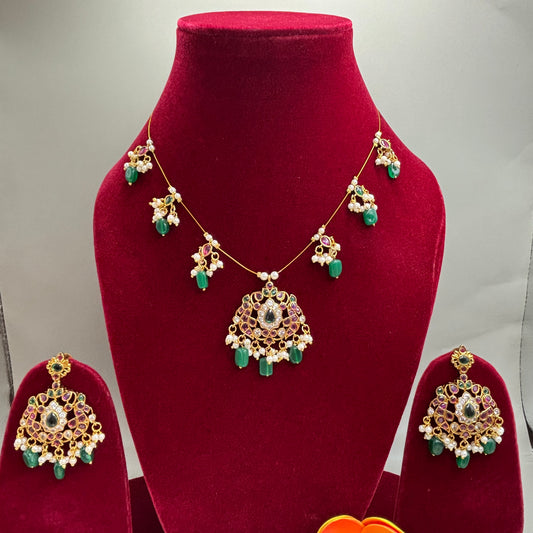 Moonlit Charm – Chandbali Invisible Chain Set with Pink & Green Kemp Stones