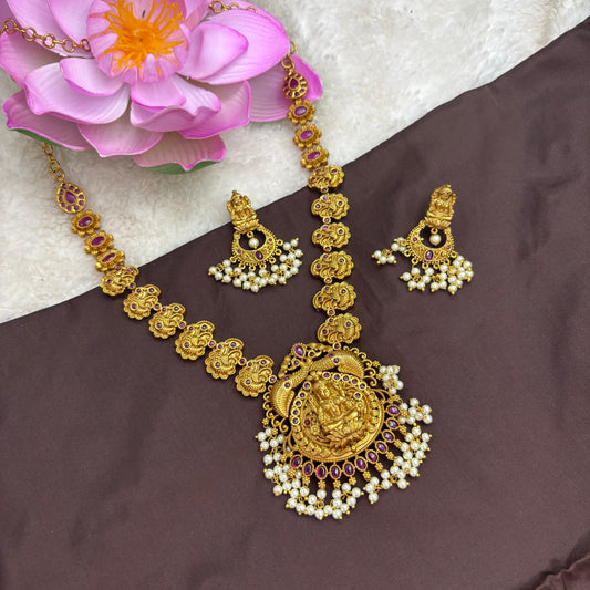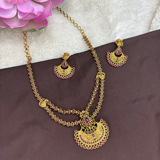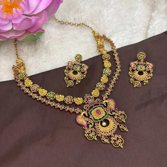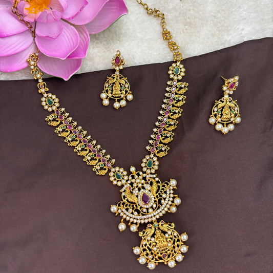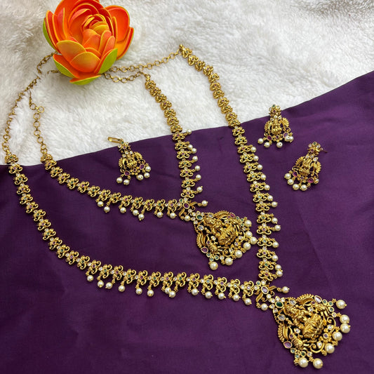 Two-Layer Temple Necklace Set with Intricate Peacock Motif – Matte Gold Finish
