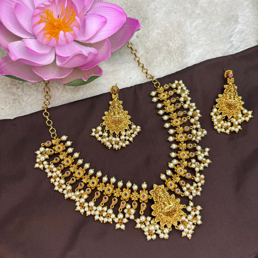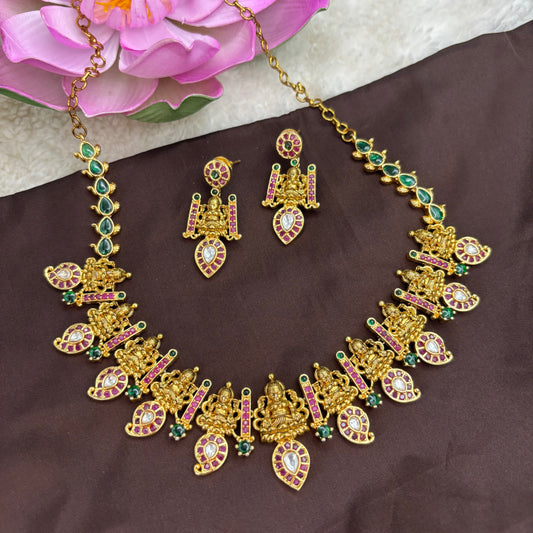 Graceful Divinity – Temple Design Matte Gold Necklace with Pink Stones & White Motifs