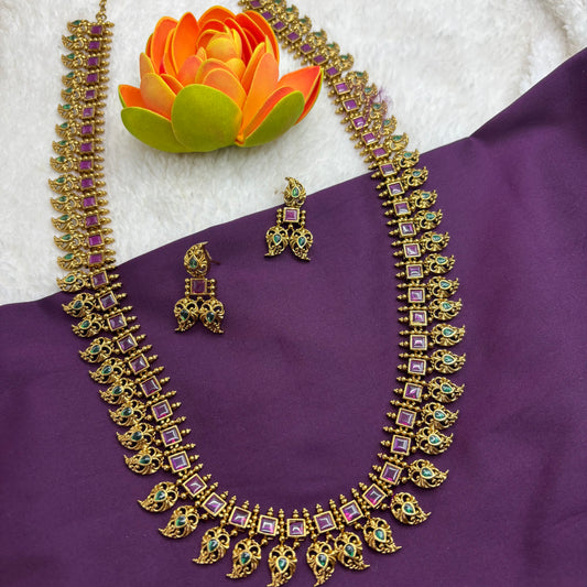 Eternal Heritage – Mango & Temple Design Necklace Set with Green and Pink Kemp Stones