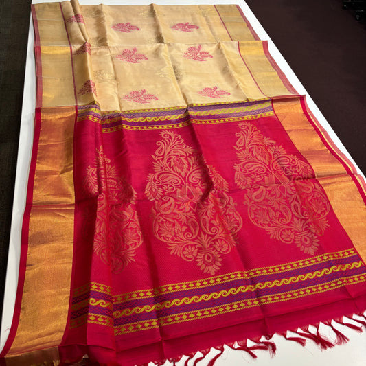 Pure Kanchipuram Silk Saree – Beige Body with Rani Pink Zari Pallu & Traditional Border