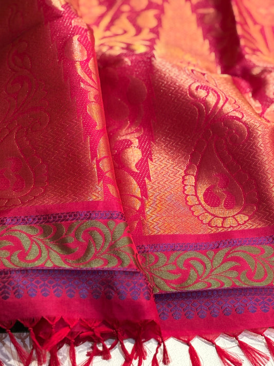 Maroon & Henna Green Dual Tone Kanchipuram Silk Saree with Pink Border & Pallu