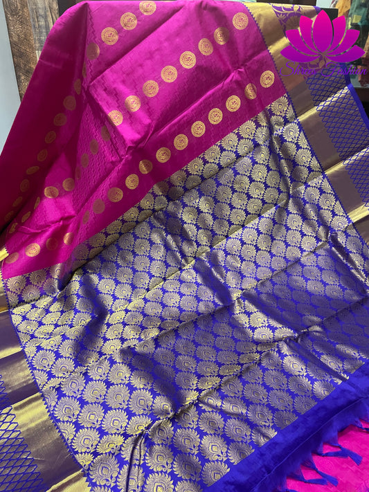 Kanchipuram Handwoven Pure Silk Saree – Royal Blue Body with Rani Pink Contrast Border and Pallu