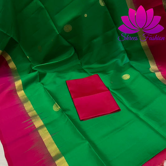 Handwoven Kanchipuram Silk Saree in Rani Pink and Bottle Green with Gold Zari Work