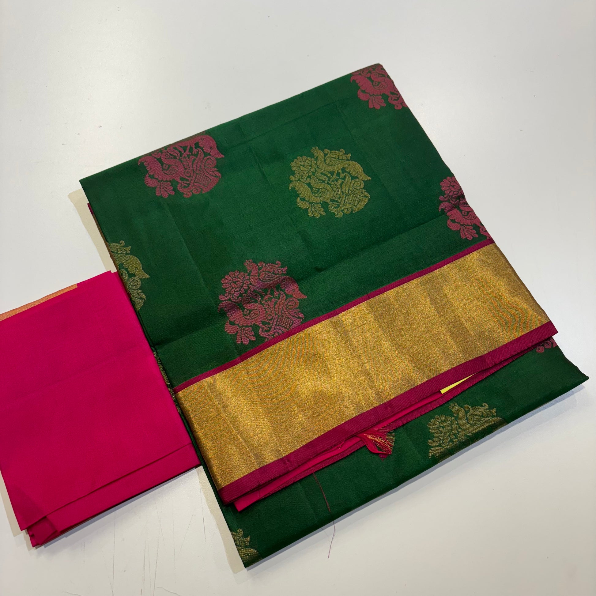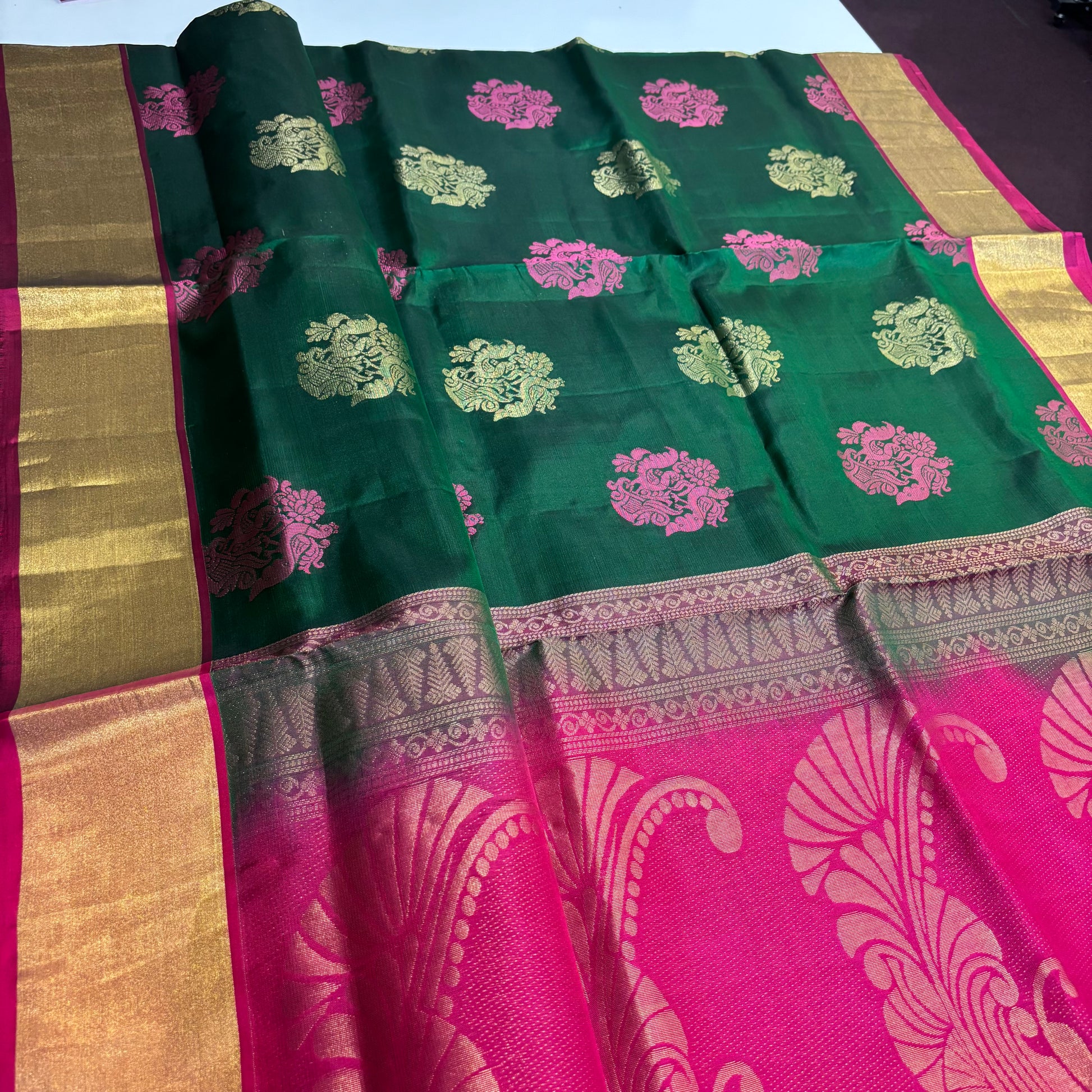 Heritage Elegance – Pure Kanchipuram Saree in Bottle Green with Magenta Zari