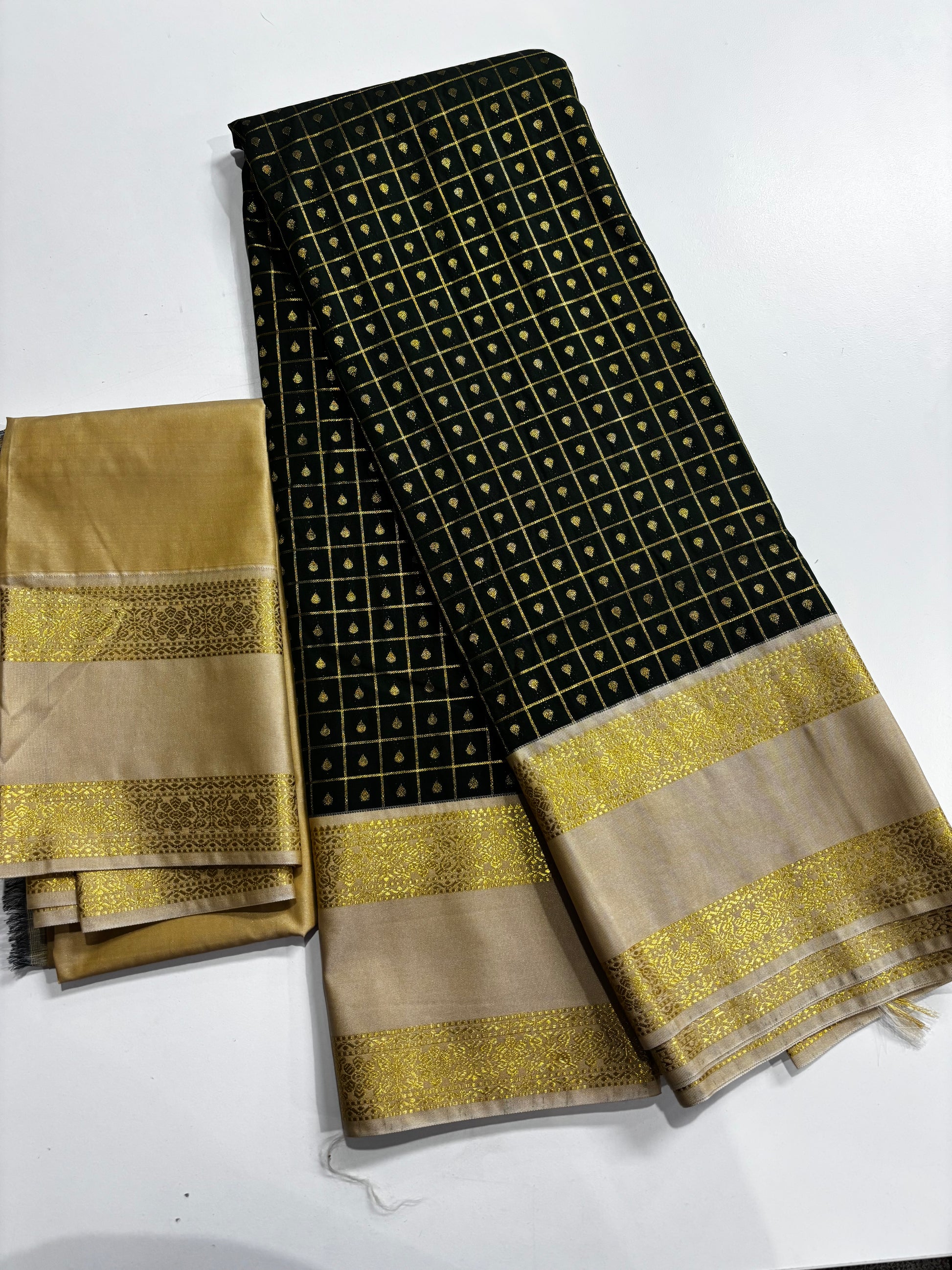 A regal colour palette brought to life with classic craftsmanship, this Semi Kanchipuram saree features a deep Bottle Green body highlighted with subtle golden motifs. The contrasting Beige border is woven with intricate golden Zari, adding a soft yet rich festive glow to the drape. Lightweight, elegant, and timeless, this saree is perfect for temple visits, weddings, festive gatherings, and cultural celebrations where tradition meets comfort.