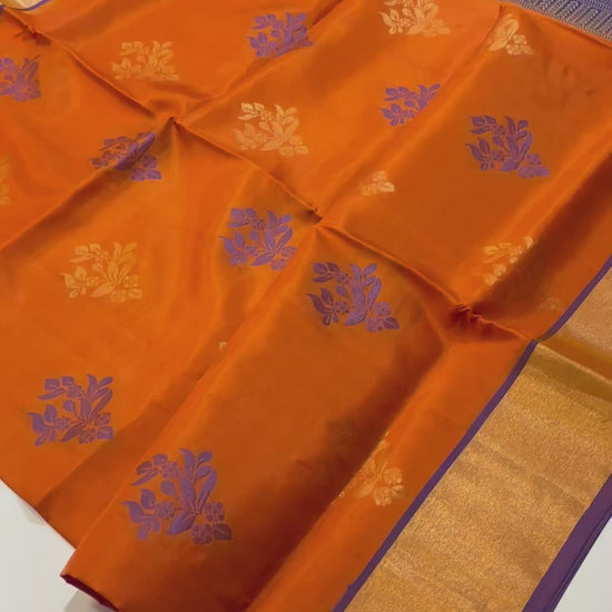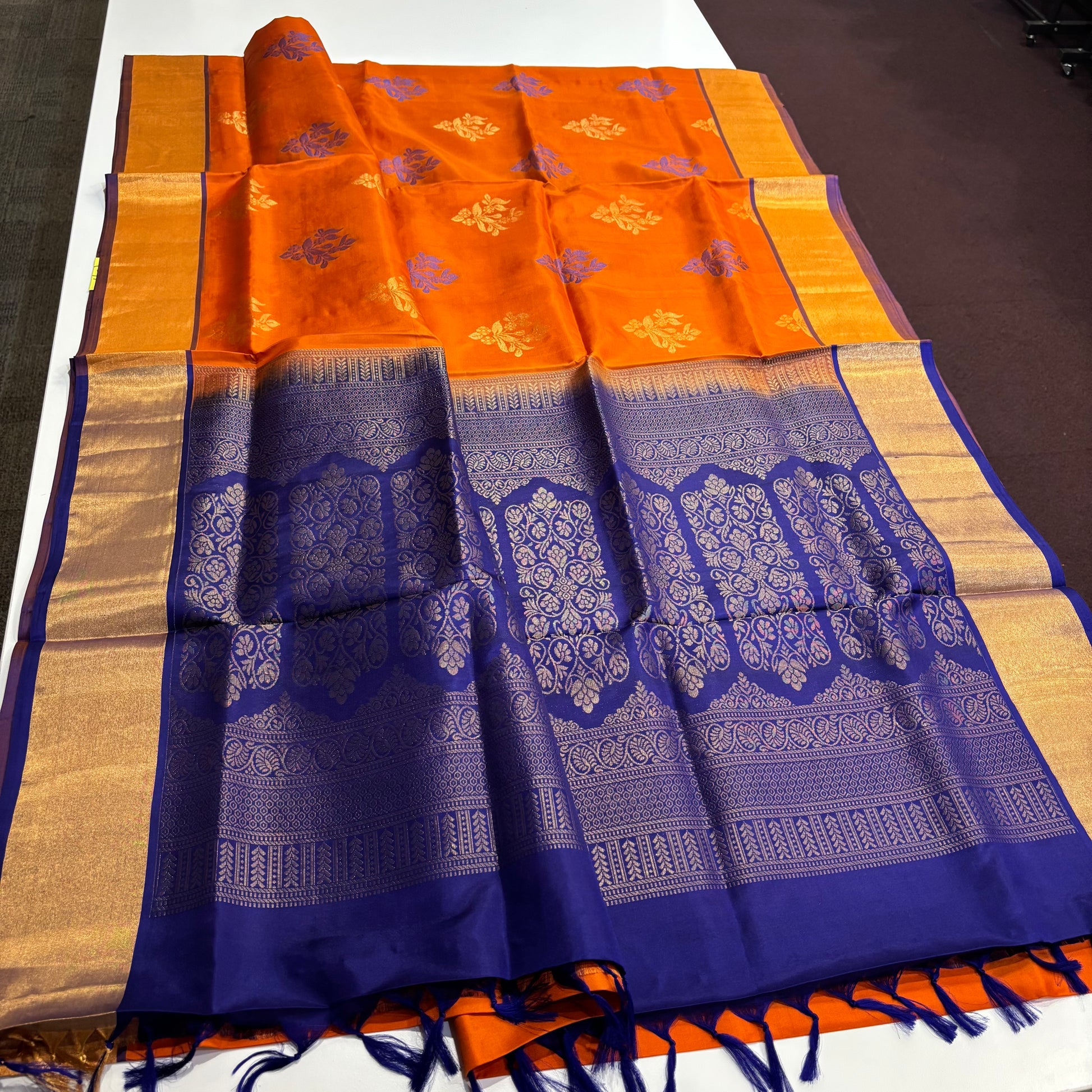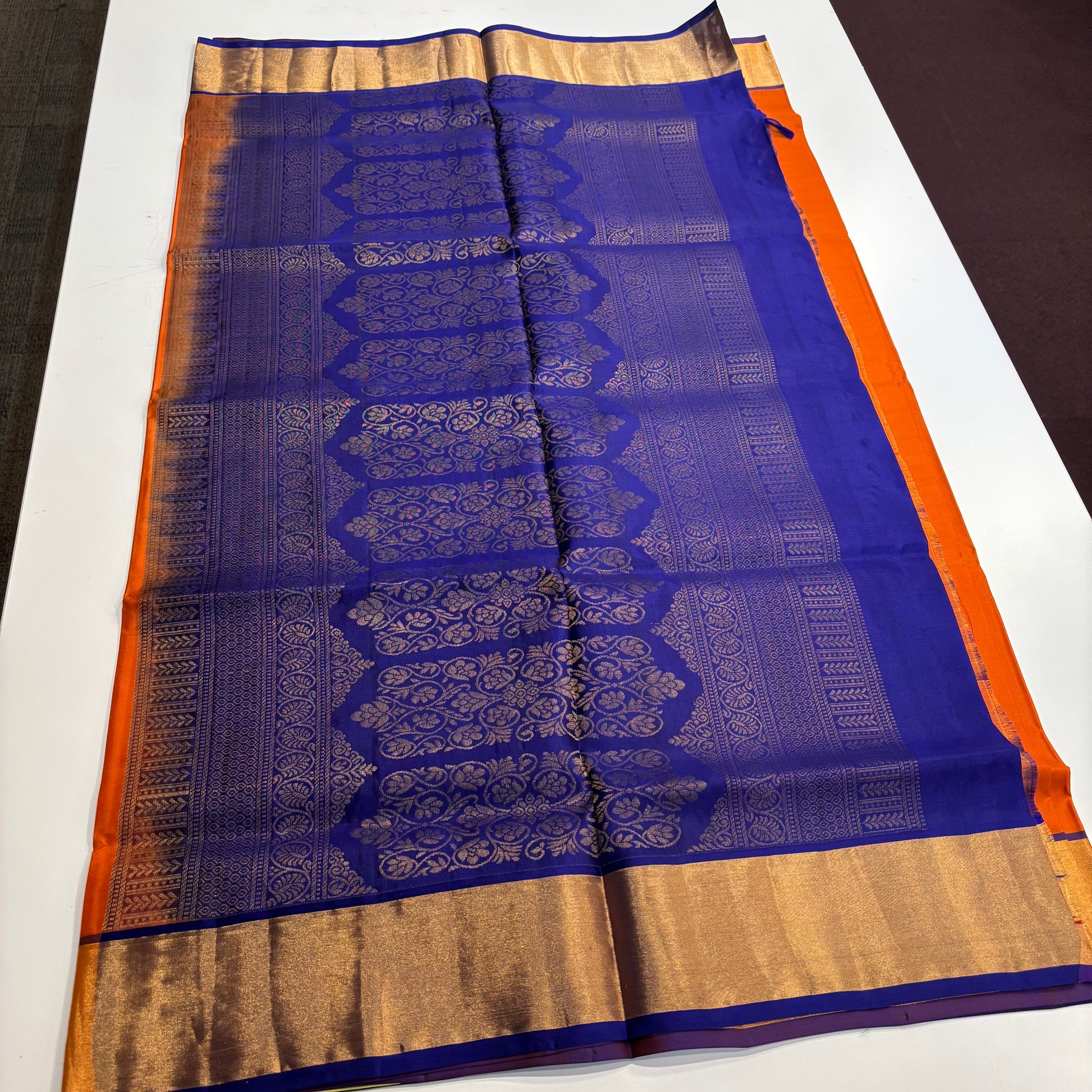 - Colour: Burnt Orange body with Vibrant Blue contrast border and pallu