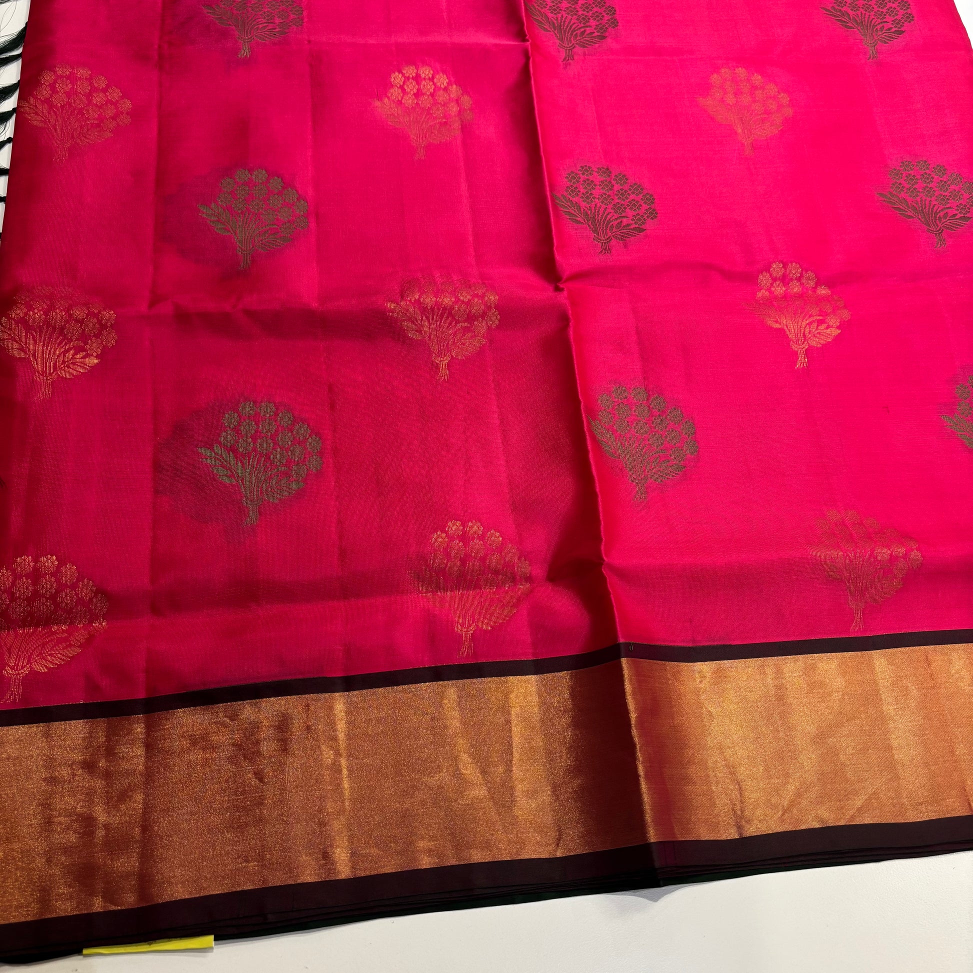 - Body: Rani pink with gold Zari motifs