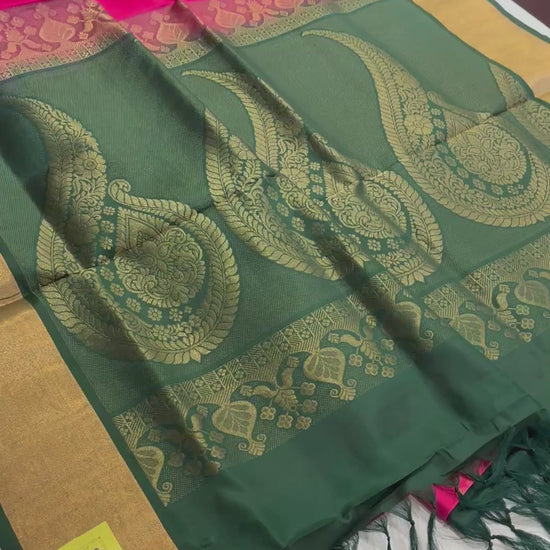Celebrate South Indian heritage with this exquisite Kanchipuram silk saree, crafted in a vibrant dual-tone palette. The body features a radiant rani pink hue, adorned with delicate gold zari motifs and framed by a traditional gold border. The pallu transitions into a rich bottle green, intricately woven with gold paisley and floral designs that reflect timeless craftsmanship. Finished with green tassels for added elegance, this saree is ideal for weddings, temple occasions, and festive gatherings.