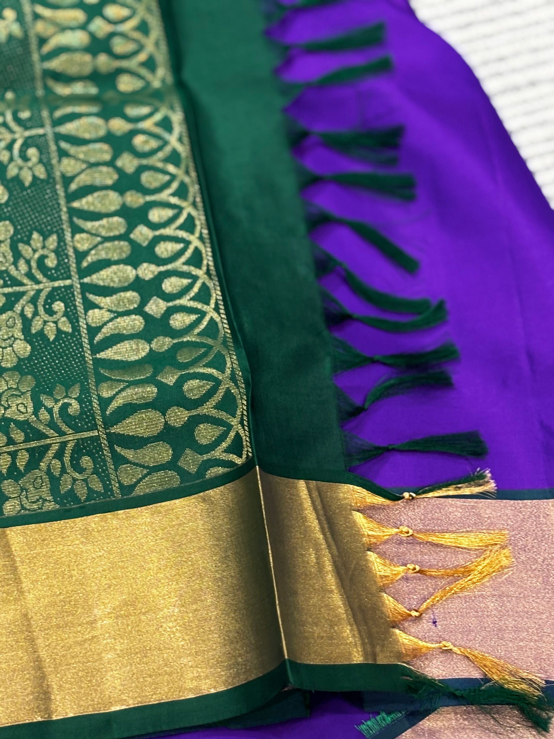 - Green Brocade Pallu — Rich golden zari weaving for a grand festive finish.