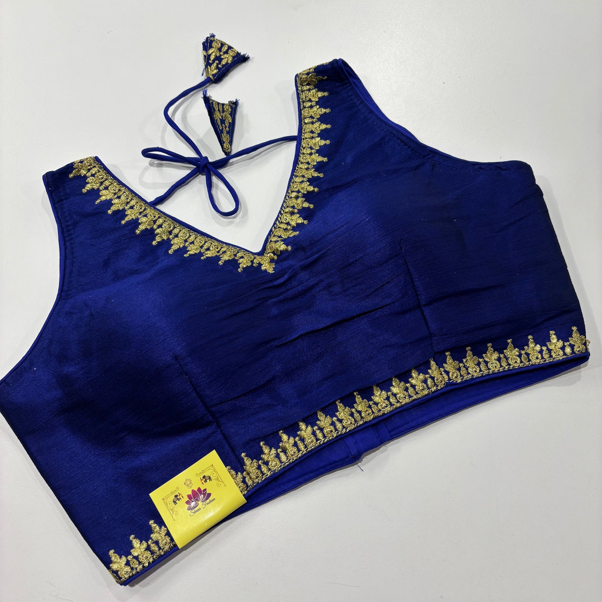 Make a bold yet graceful statement with this Royal Blue Sleeveless Blouse, featuring intricate golden embroidery and a unique attached sleeve cloth that drapes elegantly over the arms. The sleeveless cut adds modern flair, while the sleeve drape brings softness and movement—perfect for sangeet nights, receptions, or festive celebrations.